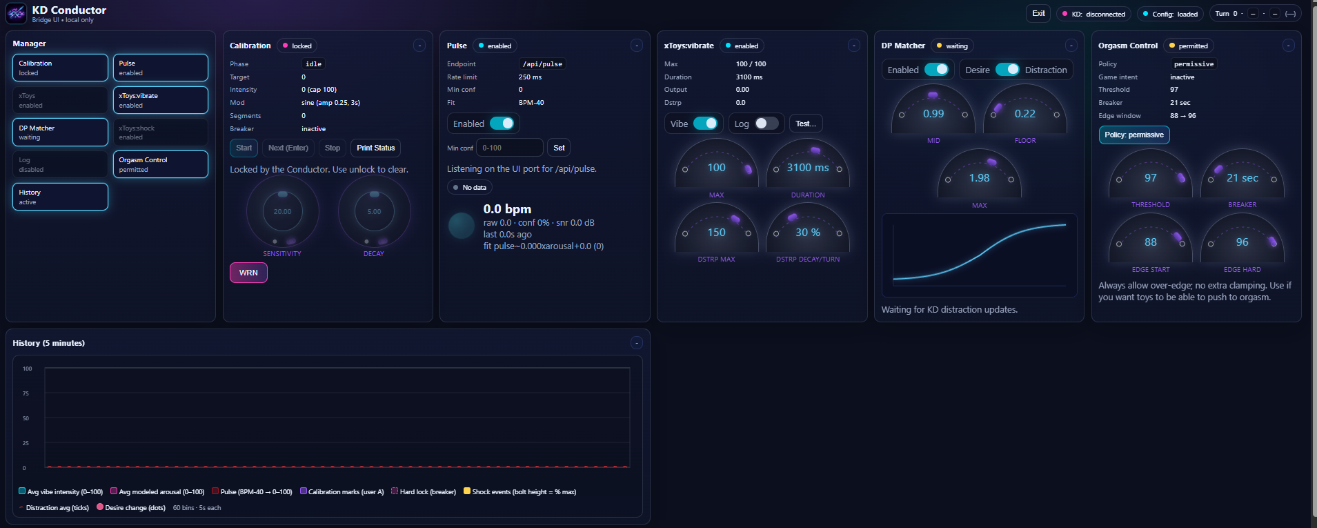 - The DP Matcher panel controls how aggressively KD Conductor tries to match your physiological arousal to your character's Distraction or Desire (choose one). If your character is more excited than you are, the vibrations will amplify. If less, they'll be dampened.
